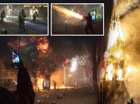 In Amsterdam, the night’s destruction culminated in a towering inferno at the famous Vondelkerk church in the early hours of the morning.